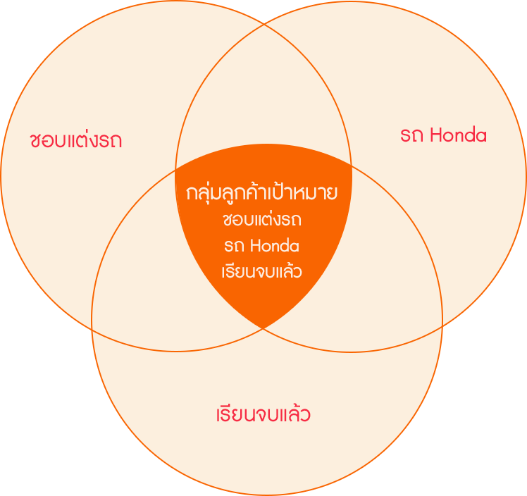 เช่น เราต้องการโฆษณาสินค้า อุปกรณ์แต่งรถยนต์ Honda เราสามารถสร้างกลุ่มเป้าหมายเชิงลึกไปได้ถึง กลุ่มคนที่ ชอบแต่งรถ และ มีรถฮอนด้า และ ต้องไม่รวมถึง