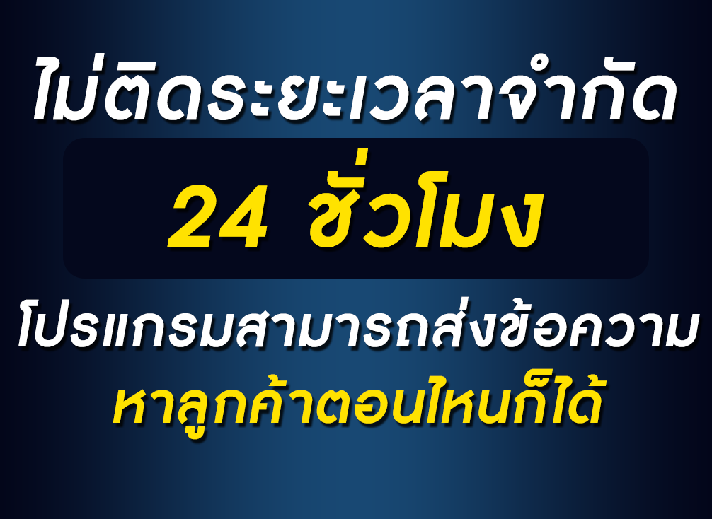 | ส่งข้อความหาลูกค้าได้แค่ภายใน 24 ชั่วโมง หลังจากที่ลูกค้าส่งข้อความสุดท้ายมา เลย 24 ชั่วโมงไปแล้ว ไม่สามารถส่งข้อความหาลูกค้าได้อีก | ส่งข้อความหาลูกค้าตอนไหนก็ได้ ไม่มีข้อจำกัดเรื่องเวลา |