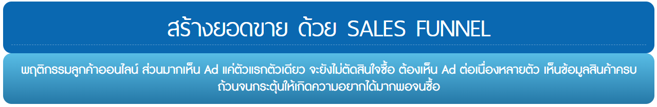 การทำ Sales Funnel การทำโฆษณาซ้ำ (Remarketing / Retargeting) ต่อเนื่องกับลูกค้าคนเดิม ให้เห็น Ad หลายตัว จนตัดสินใจซื้อ |